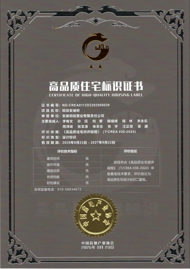 “高品質住宅標識項目”由中國房地產(chǎn)業(yè)協(xié)會聯(lián)合專業(yè)機構共同評定,從規(guī)劃設計、建筑空間、室外環(huán)境、建造品質、優(yōu)良性能到住區(qū)管理進行多維度系統(tǒng)評估。皖投·安瀾府的成功獲評,標志著項目在綜合品質方面獲得行業(yè)權威認可。