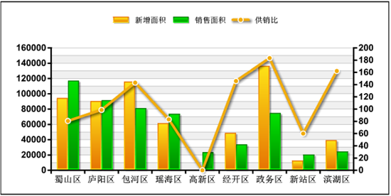 4月份期間高新區(qū)沒有新增住宅類商品房,而其他各區(qū)的新增量均保持較高的狀況,其中有六區(qū)的新增量是超過了500套,而且包河區(qū)和政務(wù)區(qū)的新增量超過了1000套,蜀山區(qū)的新增量也接近于1000套。本月期間多區(qū)新增量出現(xiàn)上漲的主要原因是由于本月期間有大量新增項目的影響,而本月期間大部分區(qū)屬的供銷狀況呈現(xiàn)了供小于求的局面,只有包河區(qū)、經(jīng)開區(qū)、政務(wù)區(qū)和濱湖區(qū)受到了大量新增項目的影響是呈現(xiàn)供大于求的局面。