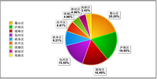 2012年4月份的片區(qū)中,蜀山區(qū)以1027套的銷售業(yè)績排9區(qū)銷售之首,占到了全市銷售比例的20%;廬陽區(qū)以958套的銷售量排名第二,占到了全市銷售比例的19%;排名第三的瑤海區(qū)的銷售量為838套,其占全市比例為16%;包河區(qū)的銷售為788套,排名第四,其占全市比例為16%;政務(wù)區(qū)的銷售為468套,其占全市比例為9%;經(jīng)開區(qū)的銷售為346套,其占全市比例為7%;濱湖區(qū)的銷售為252套,其占全市比例為5%;新站區(qū)的銷售為232套,其占全市比例為5%;高新區(qū)的銷售為174套,占全市比例為3%。