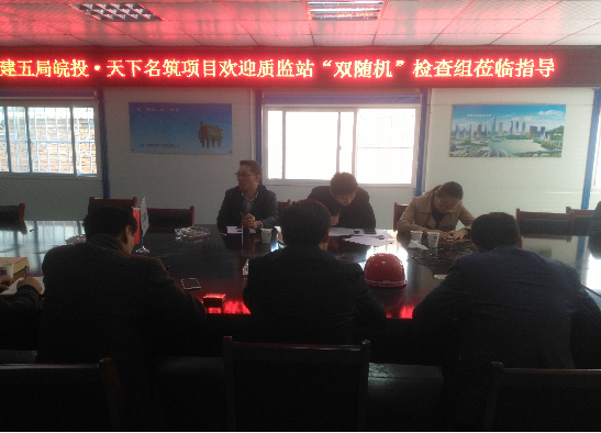 2017年11月1日上午,合肥市質(zhì)量安全監(jiān)督站相關(guān)領(lǐng)導(dǎo)蒞臨合肥天下名筑一期二標(biāo)項目進(jìn)行“雙隨機”檢查并召開專題會議,天下名筑現(xiàn)場主要負(fù)責(zé)人,監(jiān)理單位、中建五局相關(guān)負(fù)責(zé)人參加。