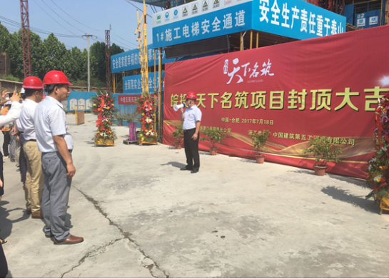 2017年7月18日上午,合肥天下名筑項目一期建設(shè)工地橫幅高掛,彩旗飄飄。伴隨著最后一方混凝土的澆筑,項目一期主體結(jié)構(gòu)全部封頂。