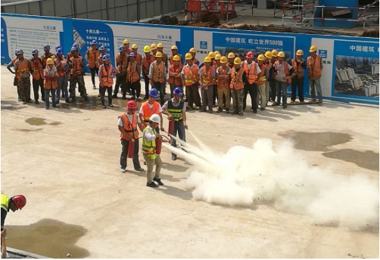 演練活動開始前,由總包單位進行消防器材的演練培訓,指導現(xiàn)場各個工種如何正確使用消防器材。隨后,項目部負責人宣講本次安全月的主題以及組織本次安全應急活動的必要性。最后,由監(jiān)理單位,總包單位及分包單位等一起進行消防應急演練活動并圓滿完成。