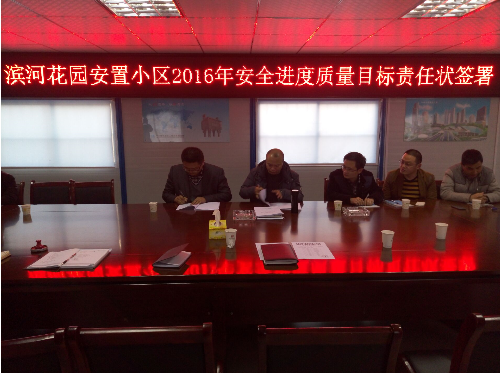 為明確安全責任,防范各類安全事故的發(fā)生,2016年3月11日,阜陽皖投置業(yè)公司組織濱河花園一期二期總包、監(jiān)理單位簽署《2016年度安全、進度、質量等目標責任狀》。
