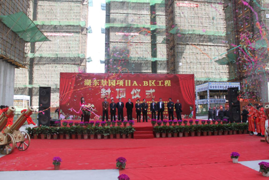 2012年3月31日上午10時(shí)18分,湖東景園項(xiàng)目A、B區(qū)工程主體結(jié)構(gòu)封頂儀式在項(xiàng)目現(xiàn)場(chǎng)隆重舉行。