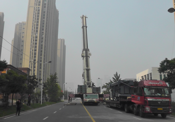 2012年10月28日,湖東景園項(xiàng)目制冷站泵房內(nèi)溴化鋰機(jī)組正式開始吊運(yùn)進(jìn)場(chǎng)。上午8時(shí)許,號(hào)稱安徽第一,最大起重量為500噸的吊車??吭诤|景園項(xiàng)目A地塊施工圍墻外預(yù)定工作區(qū)域,湖東景園項(xiàng)目部、熱電集團(tuán)工程分公司和監(jiān)理公司對(duì)吊裝前安全操作進(jìn)行最后一次現(xiàn)場(chǎng)溝通并提出相關(guān)要求,而后,吊車在進(jìn)行了必要的測(cè)試和負(fù)重等準(zhǔn)備工作后,10時(shí)許吊運(yùn)工作正式開始。