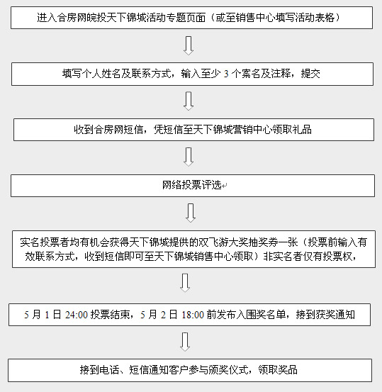 參與投票的網(wǎng)友,留下真實(shí)的聯(lián)系方式后會(huì)收到合房網(wǎng)的短信,憑短信至天下錦城營(yíng)銷中心即可獲得皖投置業(yè)提供的精美禮品一份和頒獎(jiǎng)典禮的抽獎(jiǎng)券。