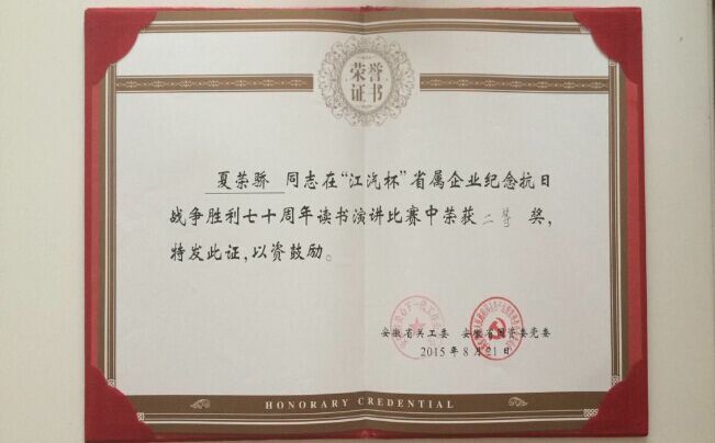 2015年8月21日,由省關(guān)工委、省國(guó)資委黨委、省國(guó)資委關(guān)工委聯(lián)合舉辦的大型演講比賽在江汽集團(tuán)研發(fā)中心隆重舉行,三十余家省國(guó)資企業(yè)參賽,經(jīng)過激烈角逐,代表我司及集團(tuán)公司參賽的夏榮驕同志以一篇《回憶里選擇未來(lái)》打動(dòng)了評(píng)委及現(xiàn)場(chǎng)觀眾,獲得評(píng)委高度贊揚(yáng)并榮獲二等獎(jiǎng),充分展示了國(guó)企員工的風(fēng)采,為集團(tuán)公司和我司爭(zhēng)得了榮譽(yù)。